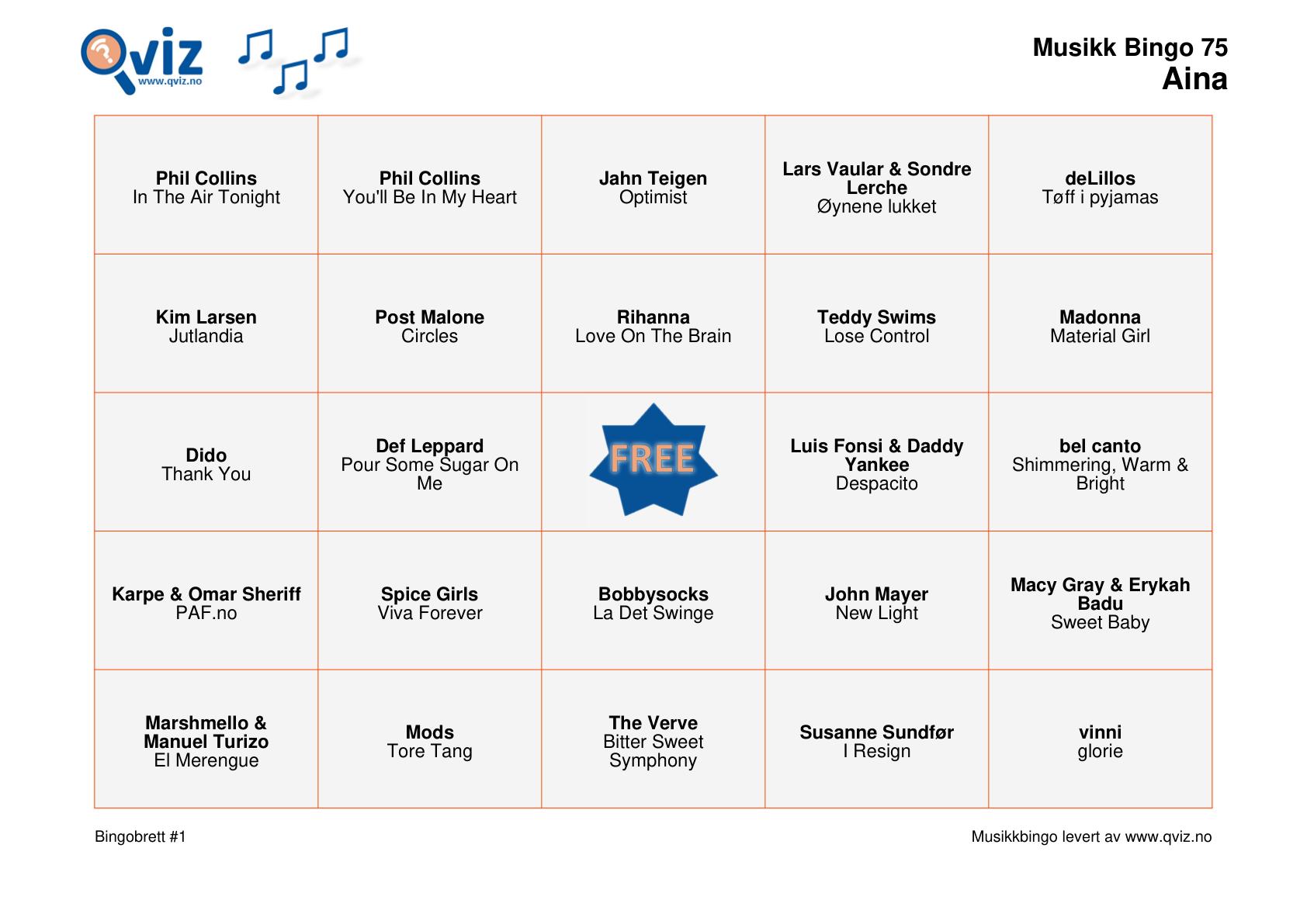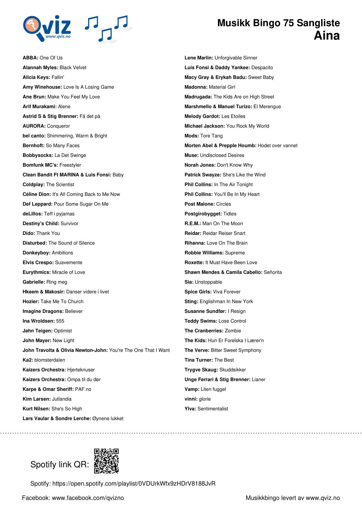 For alle bingoene får du PDF fil med 300 bingobrett og lenke til Spotify spilleliste.