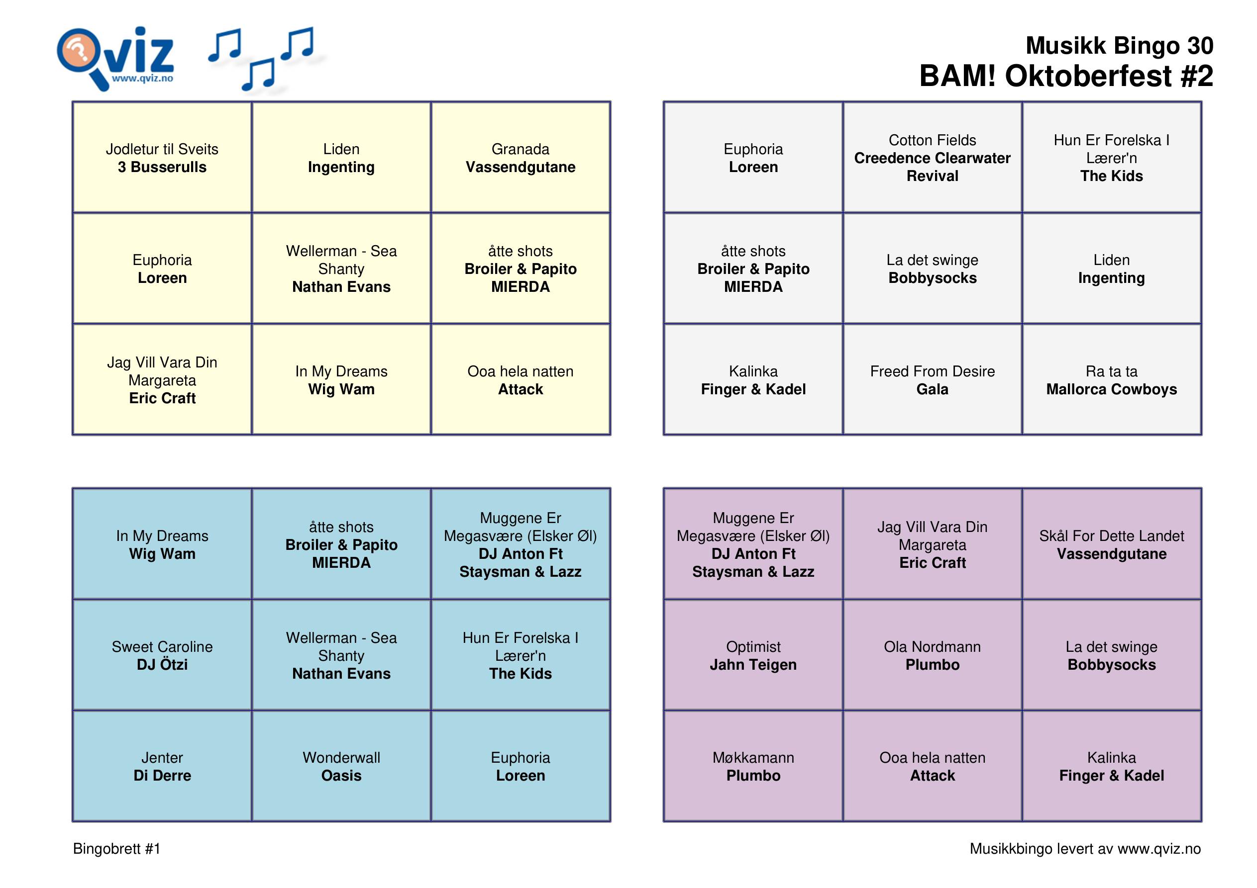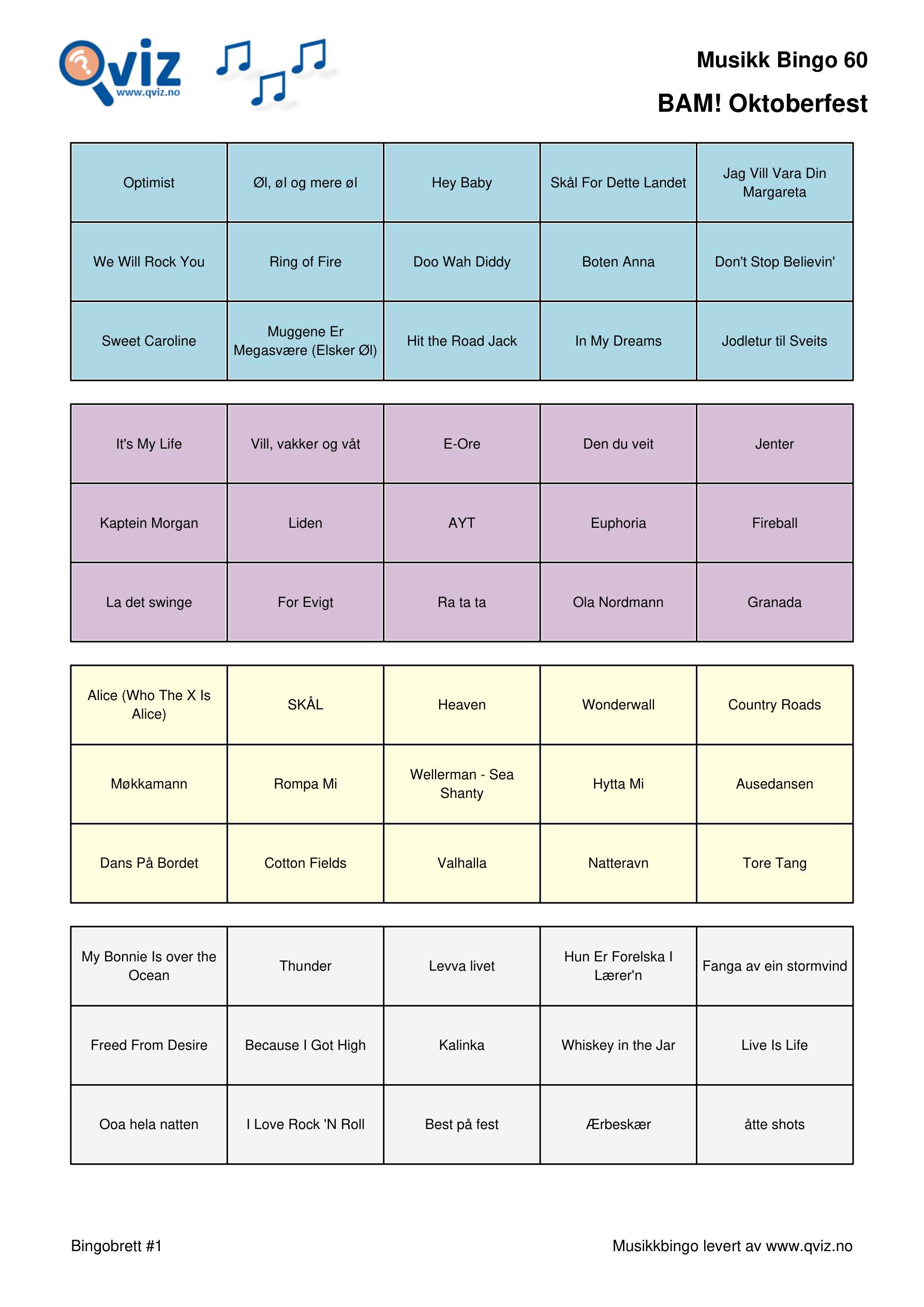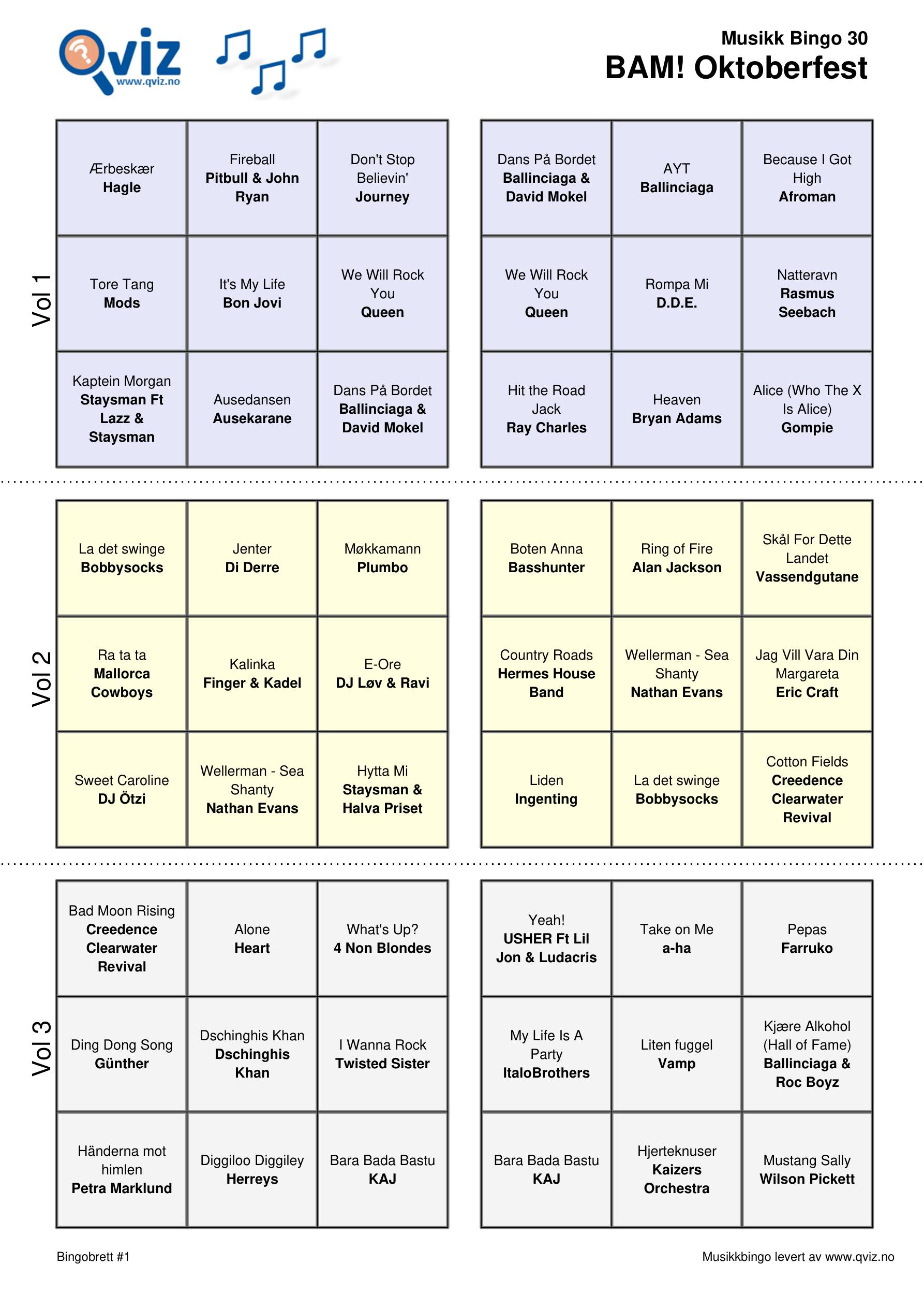 BAM! What a music bingo Edition: Oktoberfest består av kjente allsang-låter som skaper den rette stemningen til en skikkelig Oktoberfest. Du får også med en tilpasset musikk quiz på kjøpet!