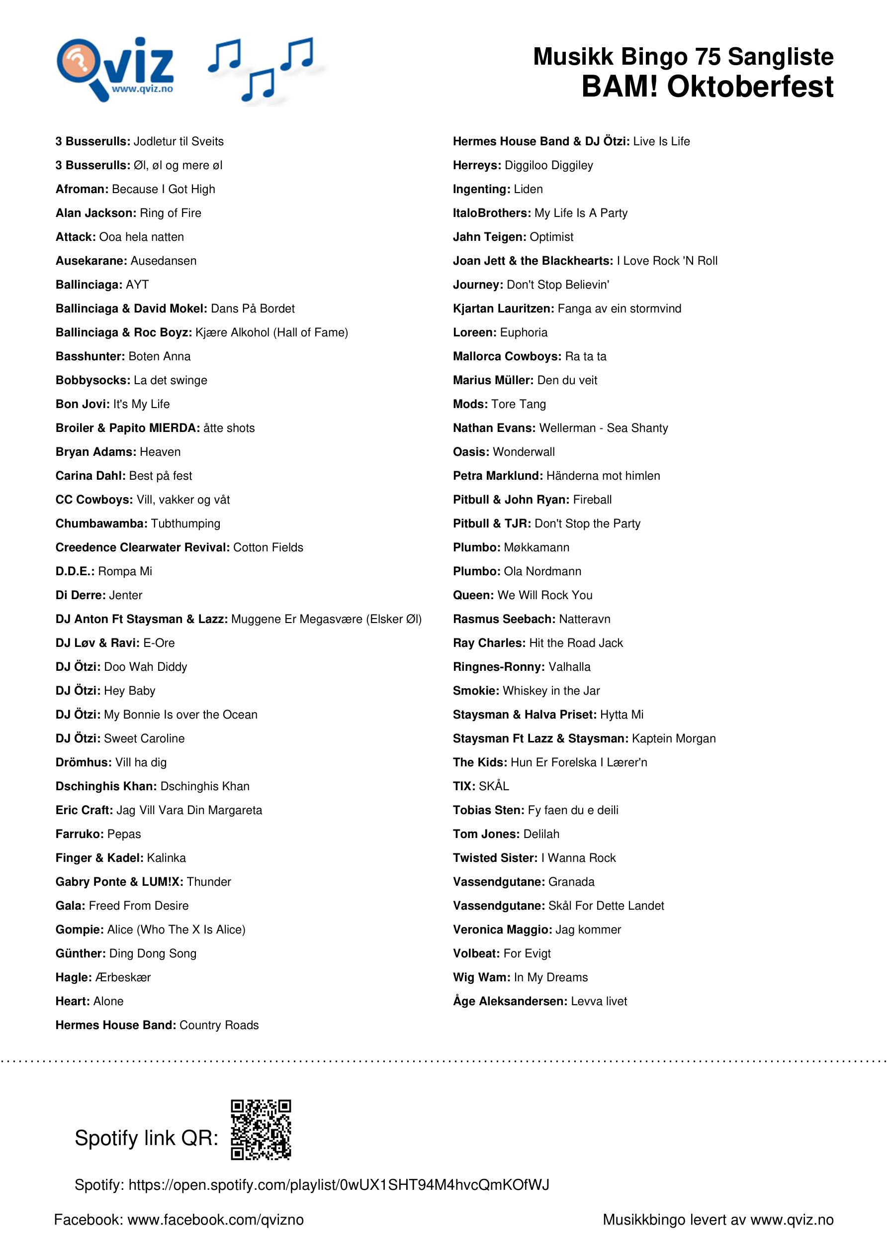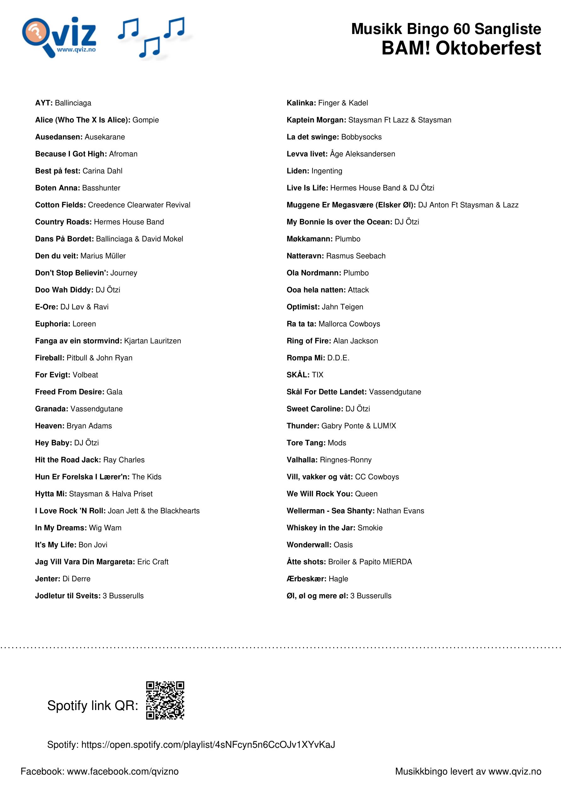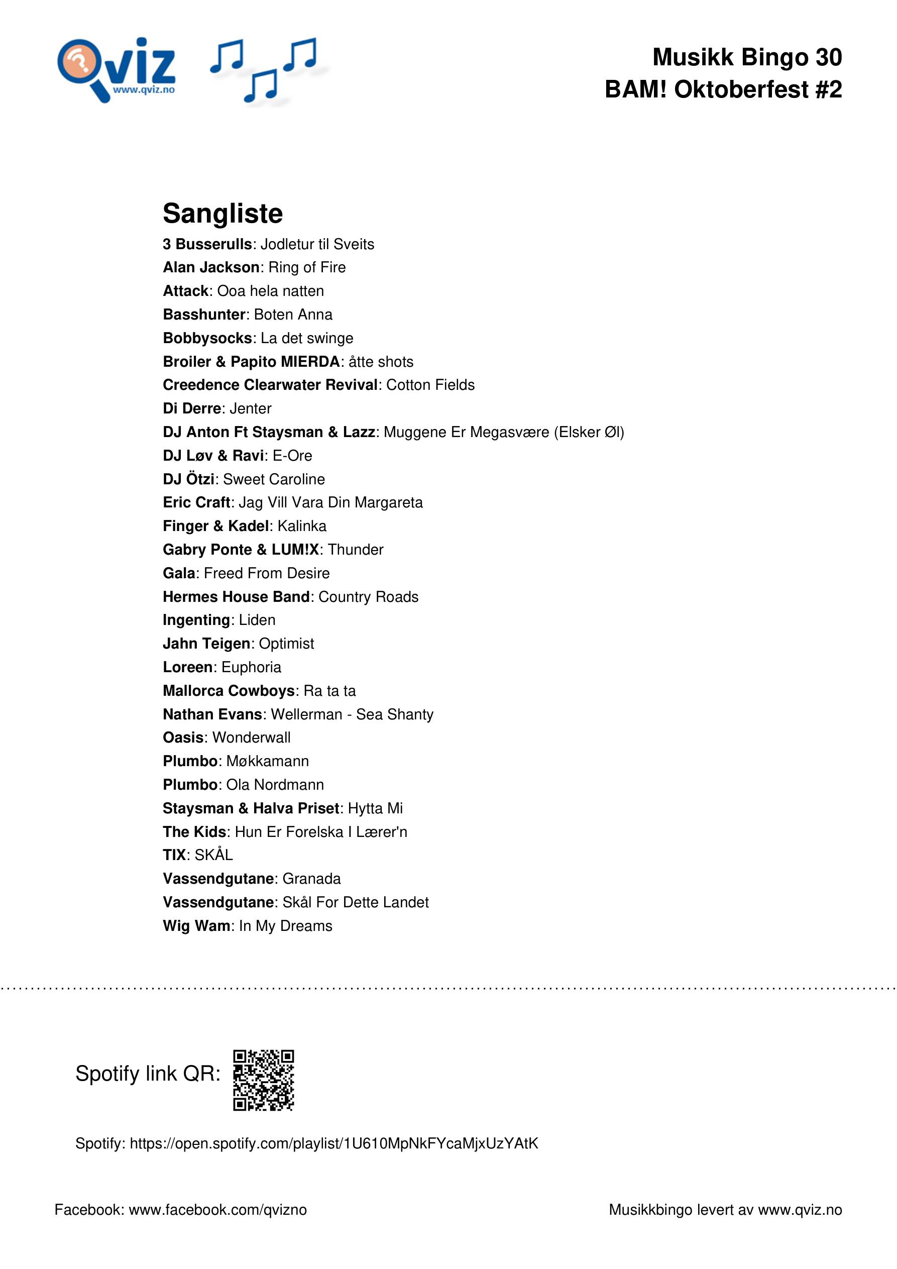 Musikk bingo er basert på denne spillelisten: https://open.spotify.com/playlist/7dNGMQfSnRlbcxMk4tYThG
