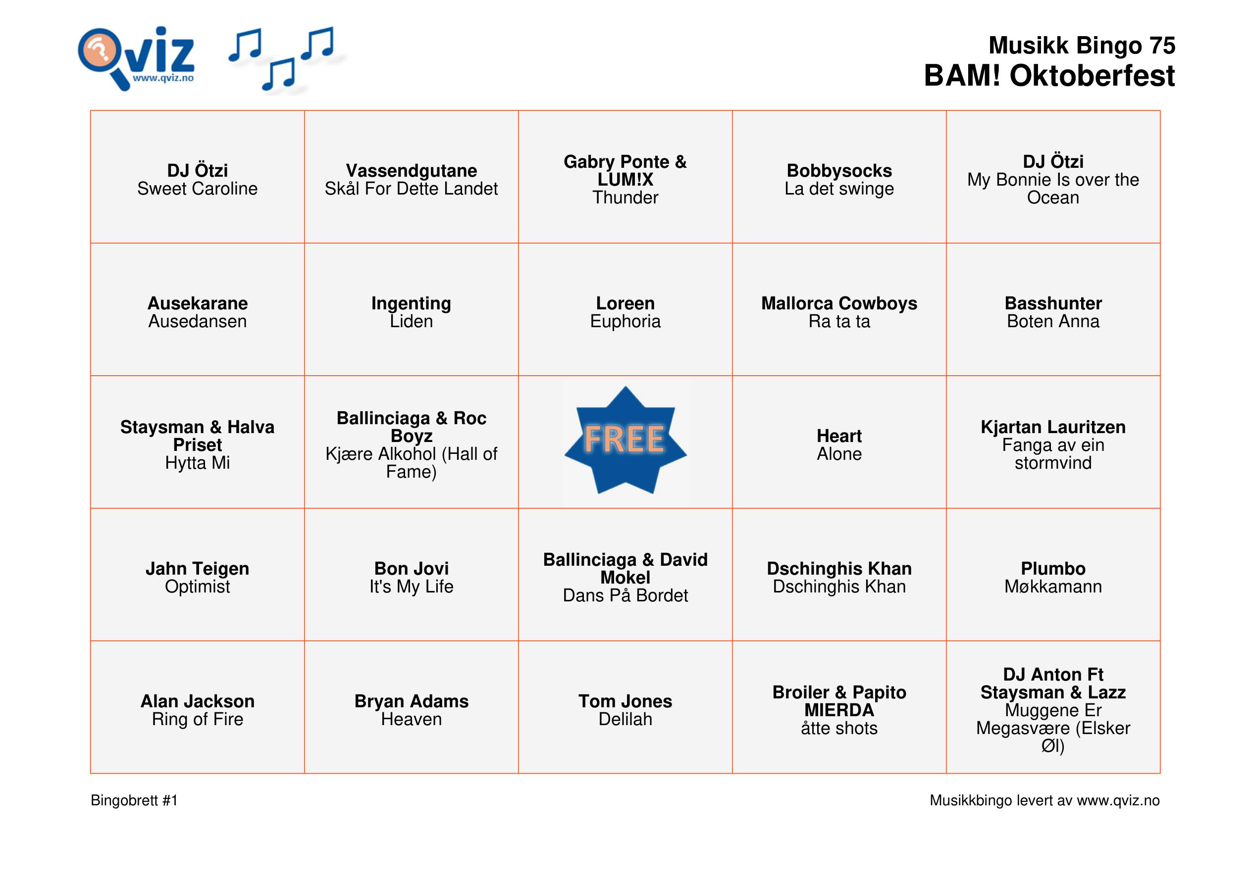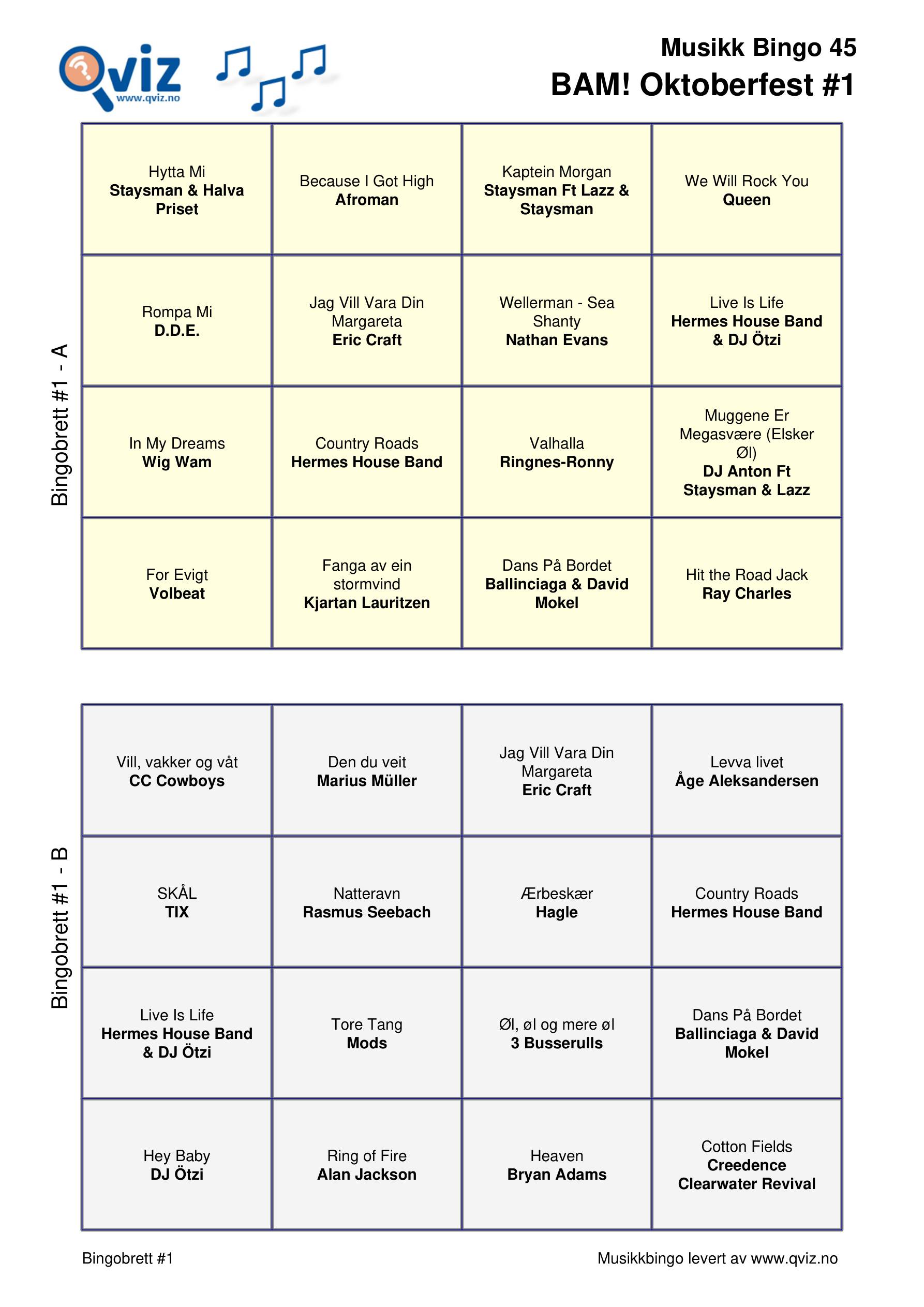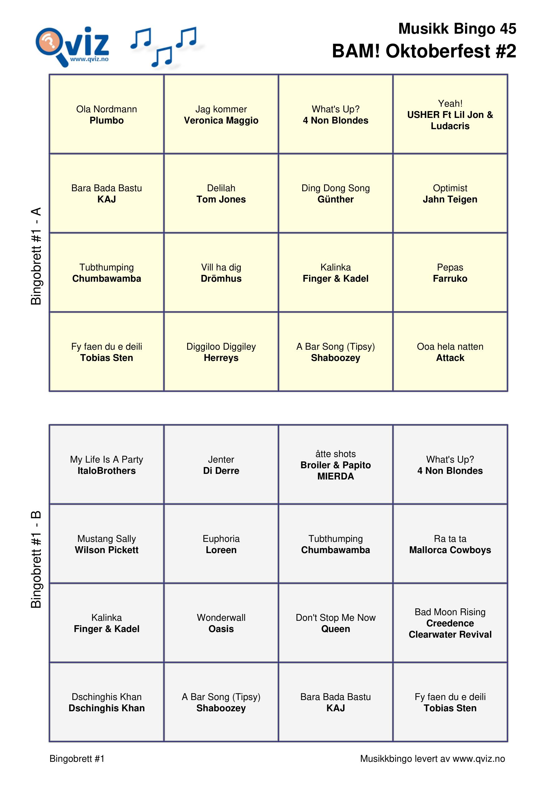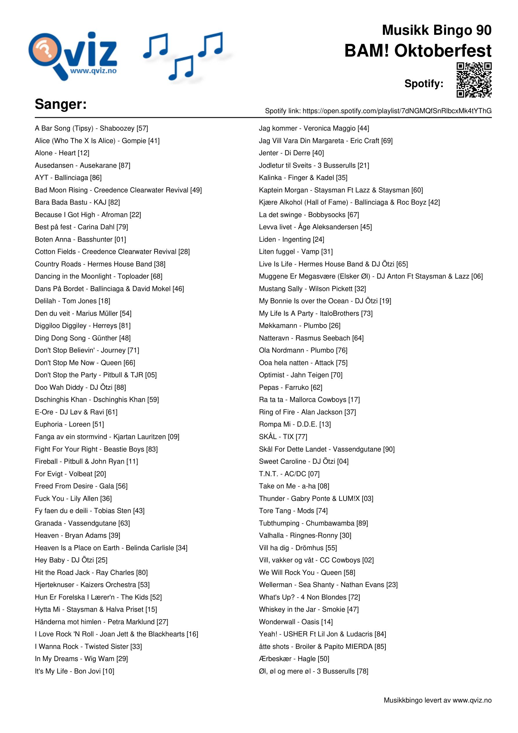 BAM! What a music bingo Edition: Oktoberfest har de beste og mest kjente allsang-låtene som garantert får i gang festen og skaper den rette stemningen til en skikkelig Oktoberfest.