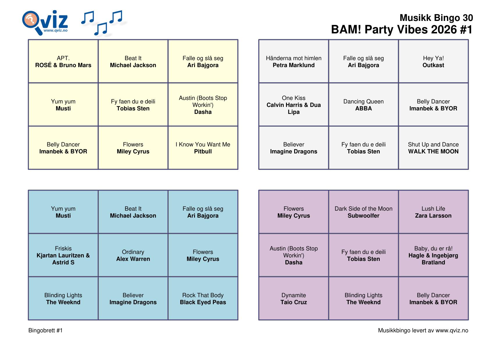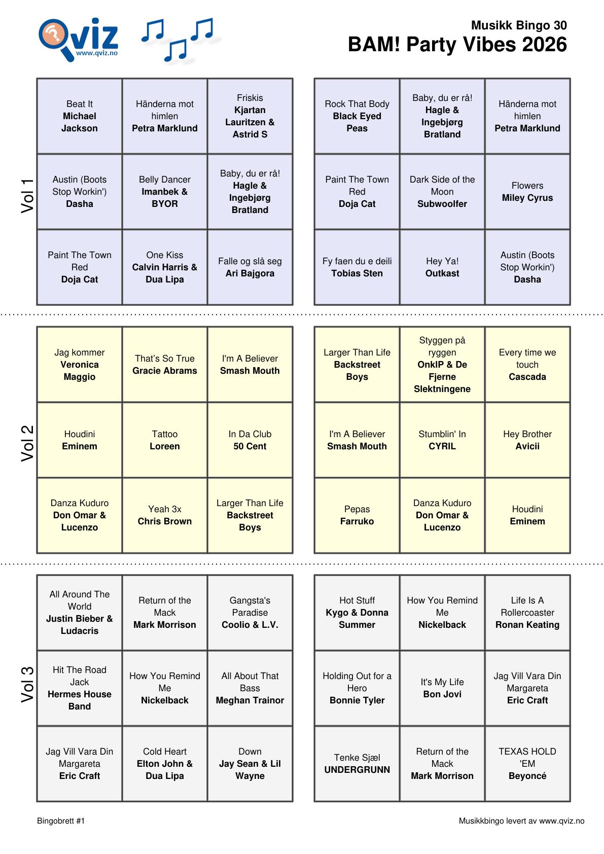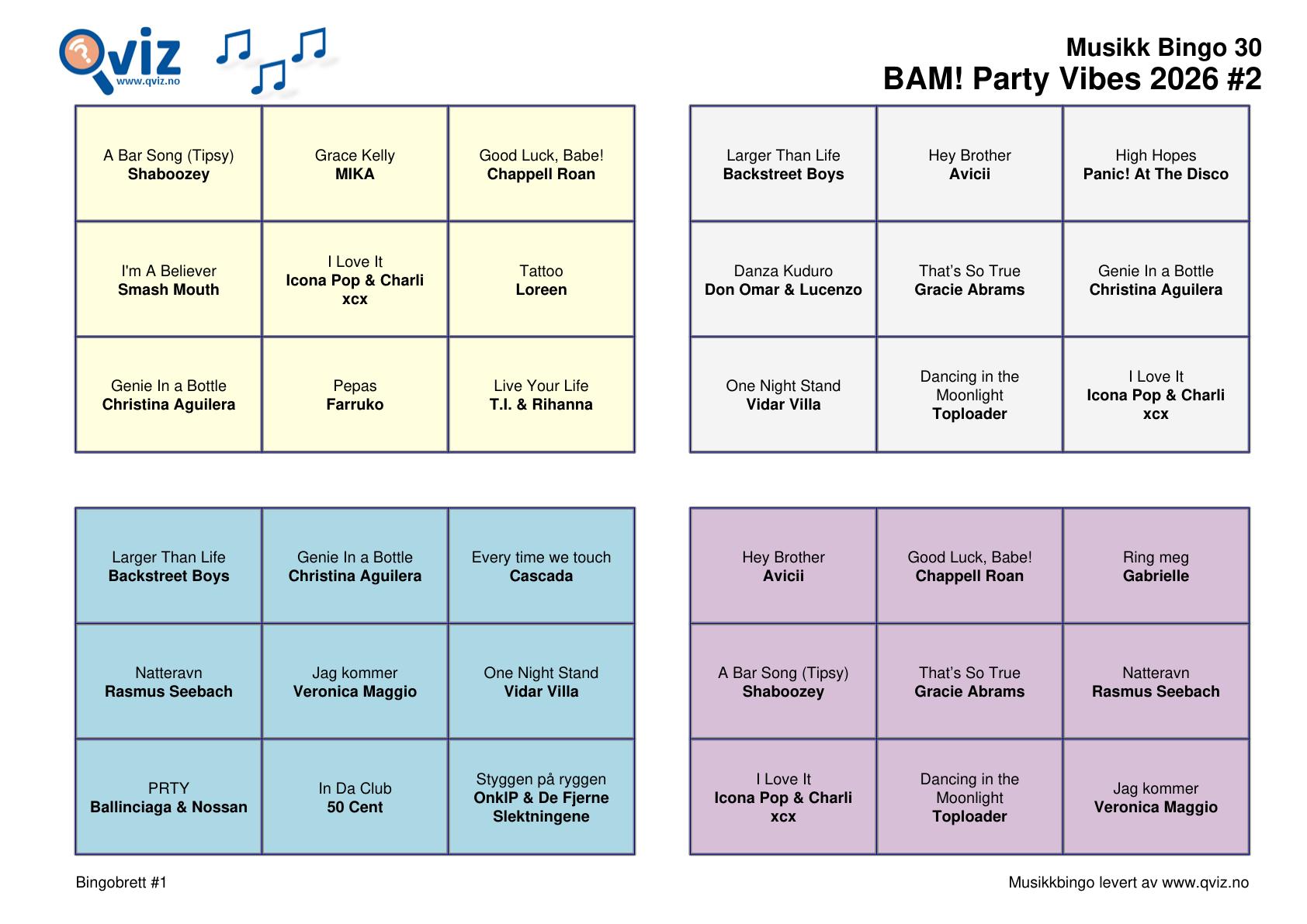 Med BAM! Party Vibes 2026 får du en musikkbingo med varierte låter – fra helt nytt til litt gammelt. En sosial og engasjerende musikkopplevelse som samler folk rundt kjente hits, gode vibber og ekte feststemning.