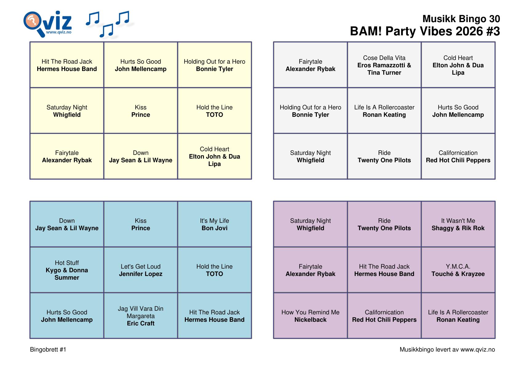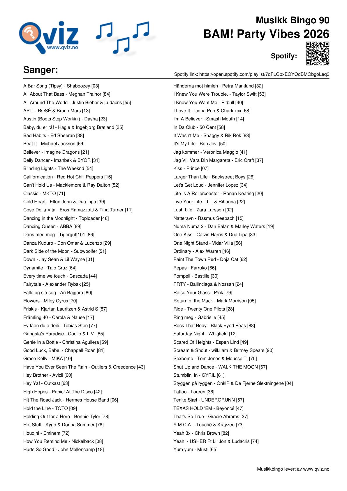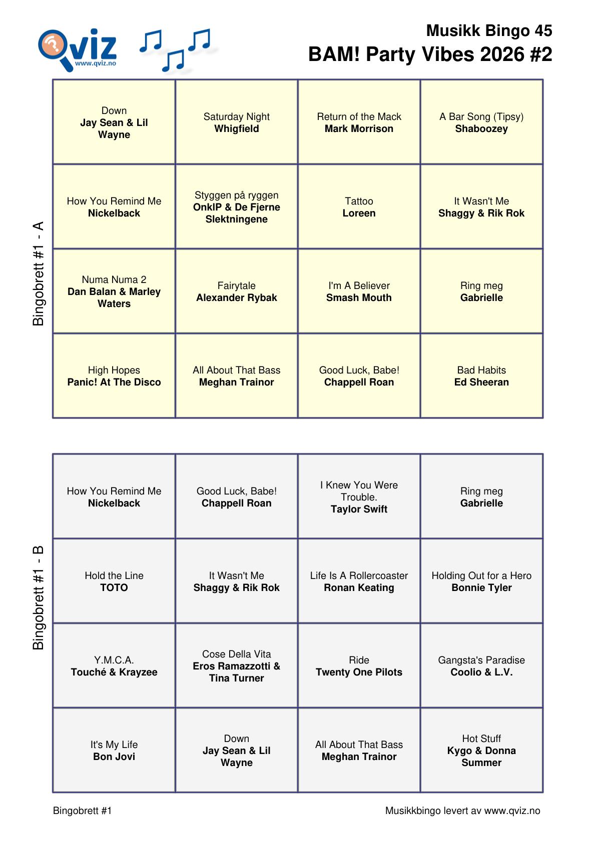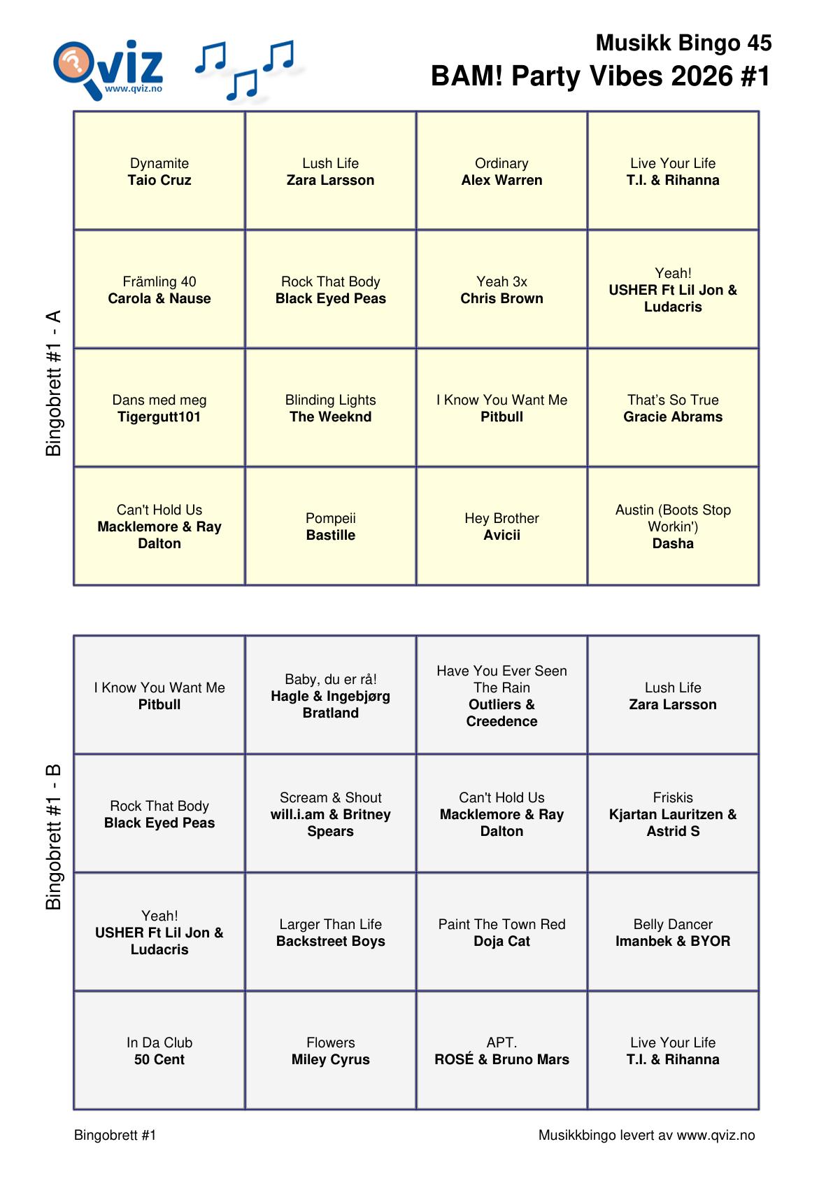Med BAM! Party Vibes 2026 får du en musikkbingo med varierte låter – fra helt nytt til litt gammelt. En sosial og engasjerende musikkopplevelse som samler folk rundt kjente hits, gode vibber og ekte feststemning.