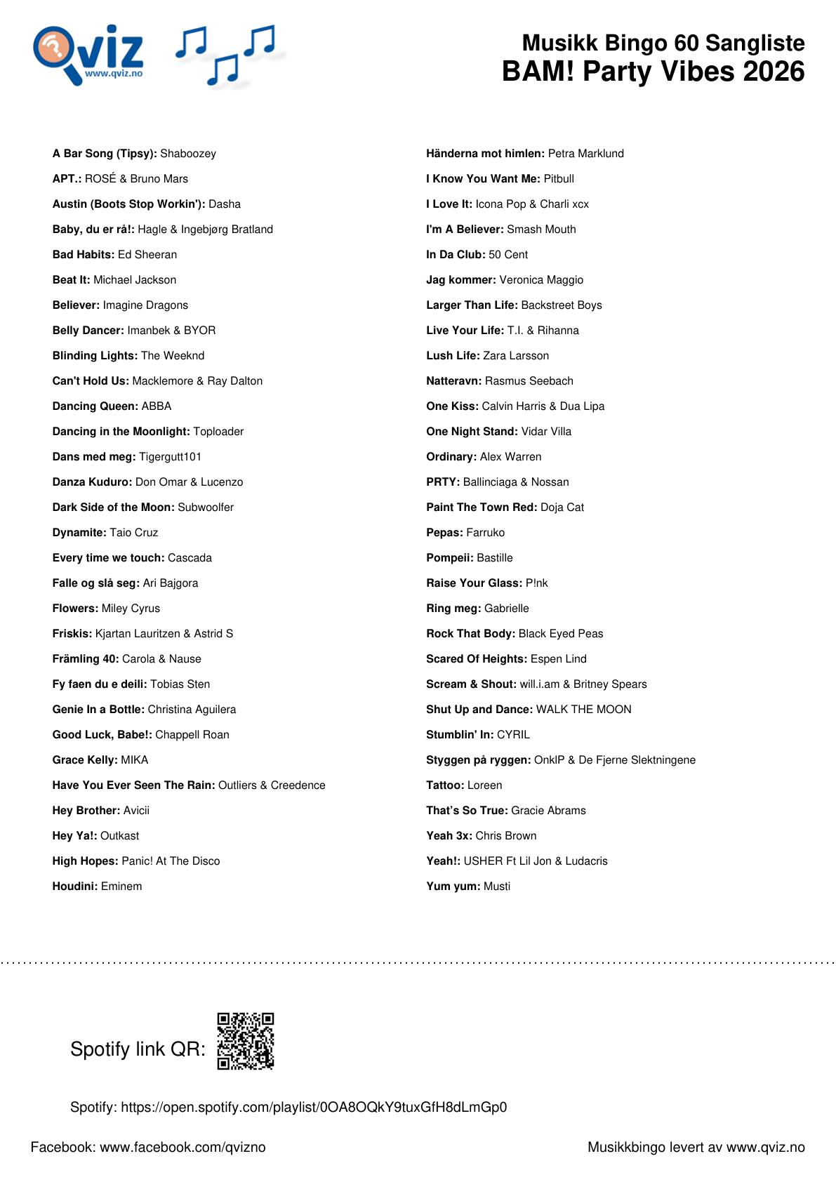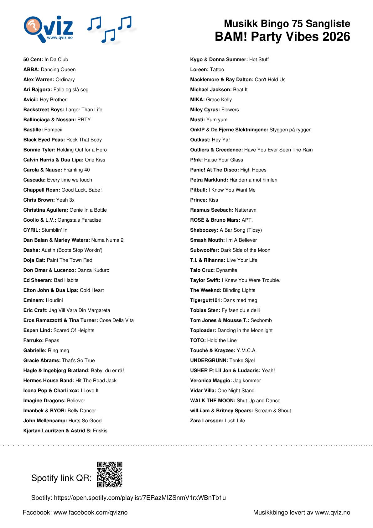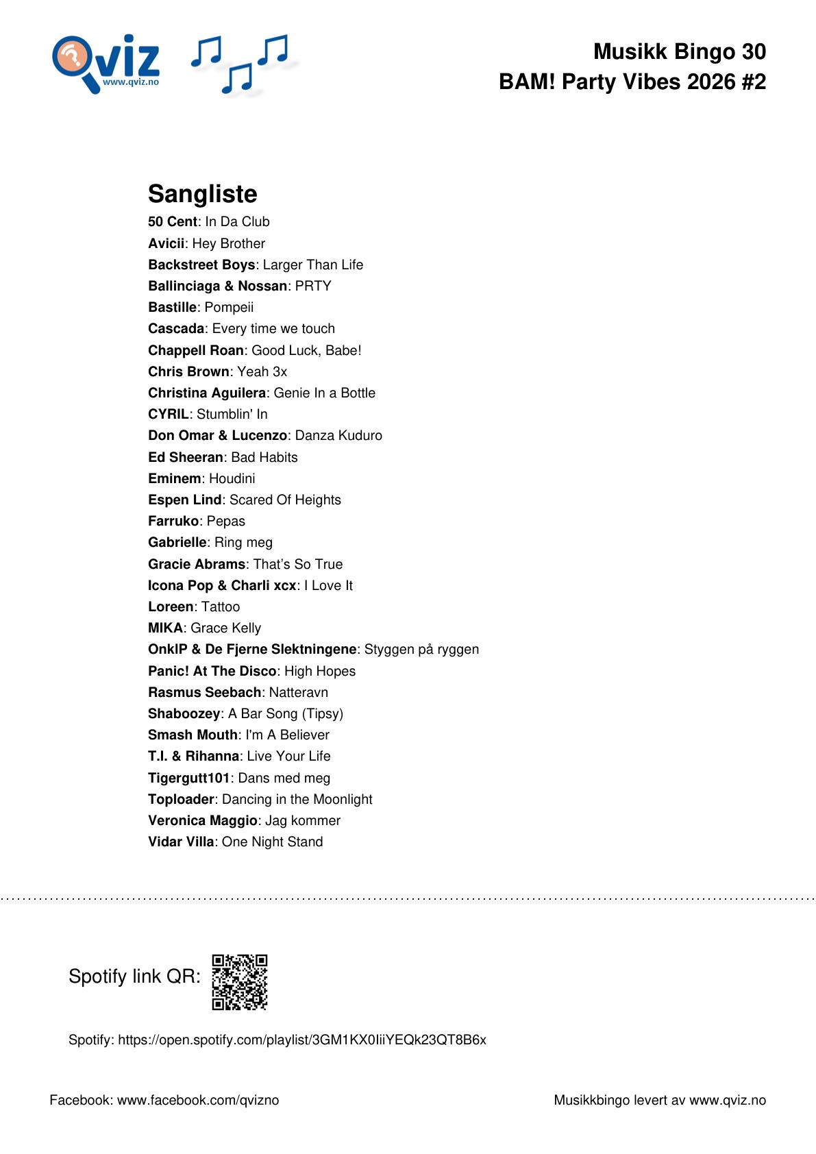 Musikk bingo er basert på denne spillelisten: https://open.spotify.com/playlist/7qFLGpxEOYOdBMObgoLeq3