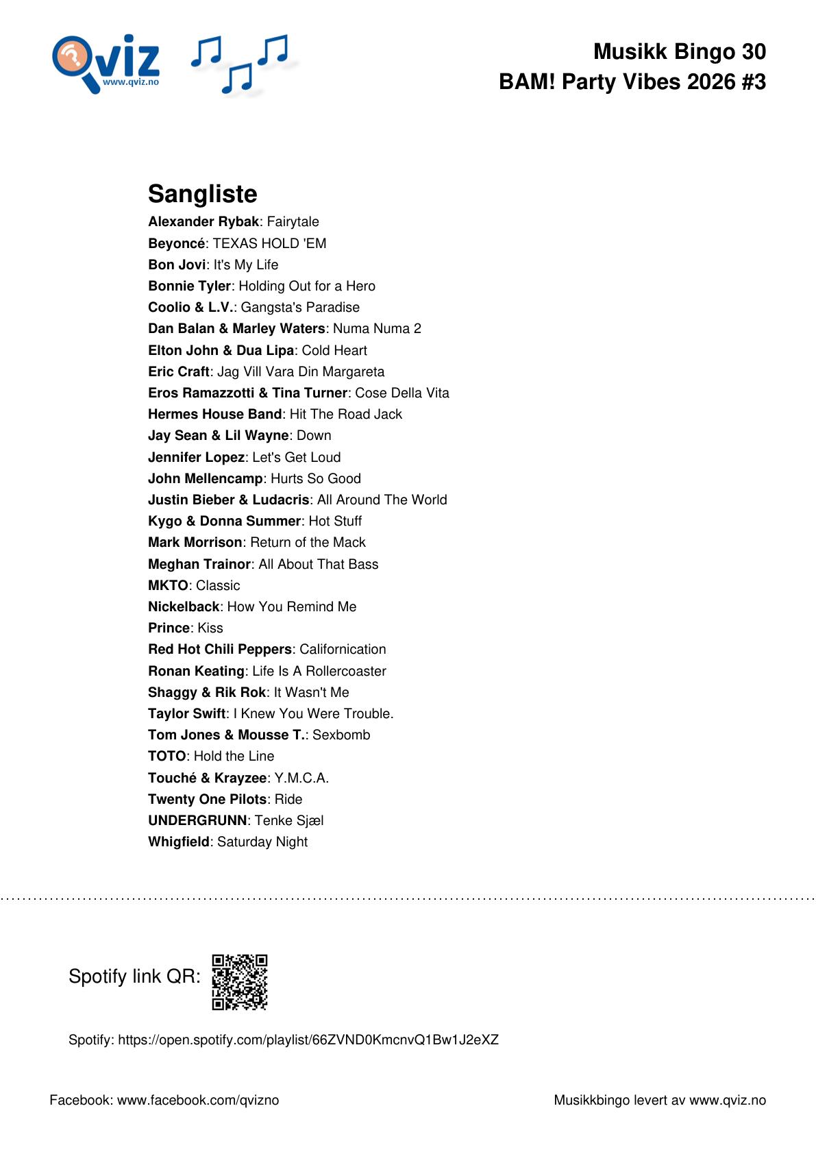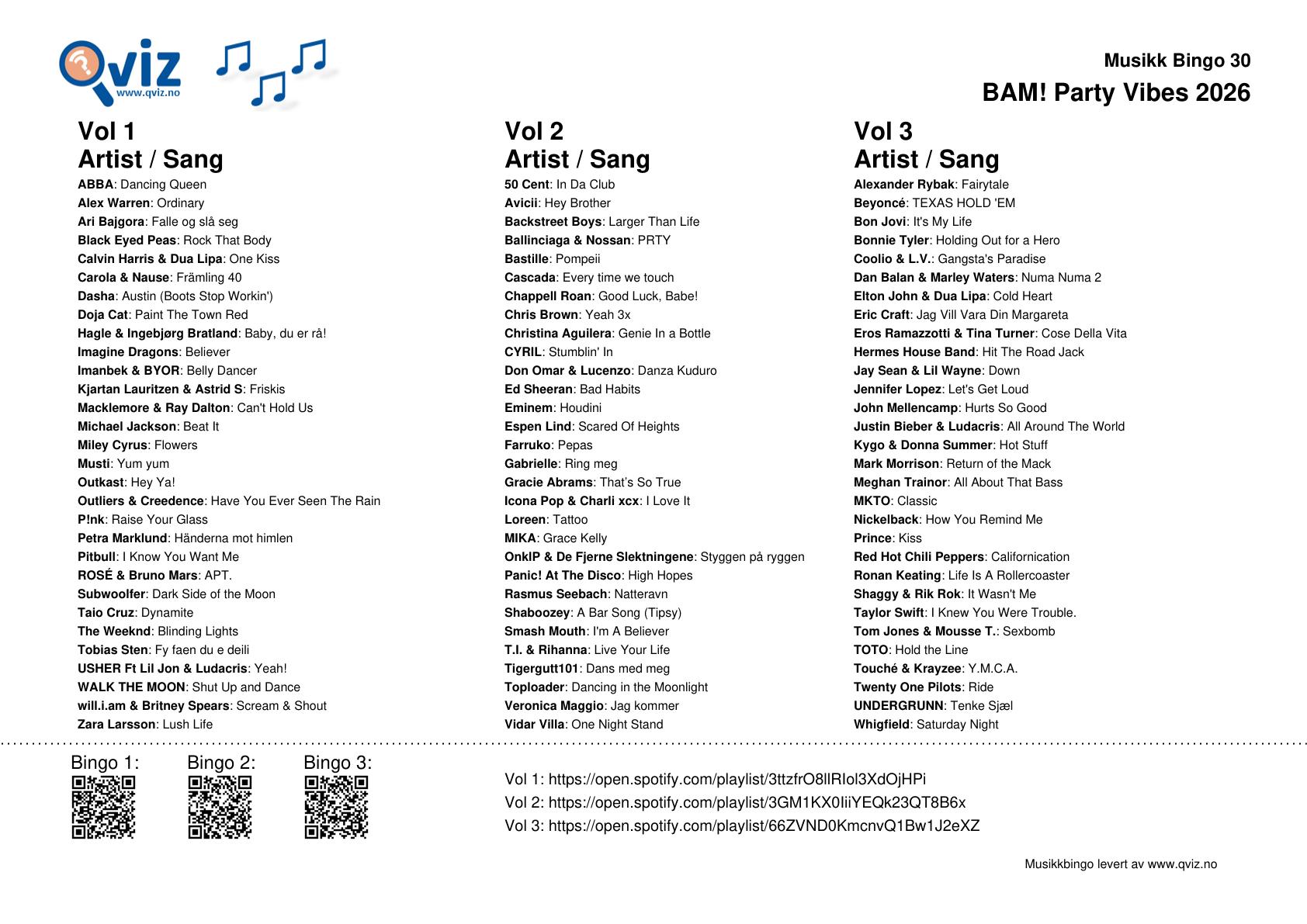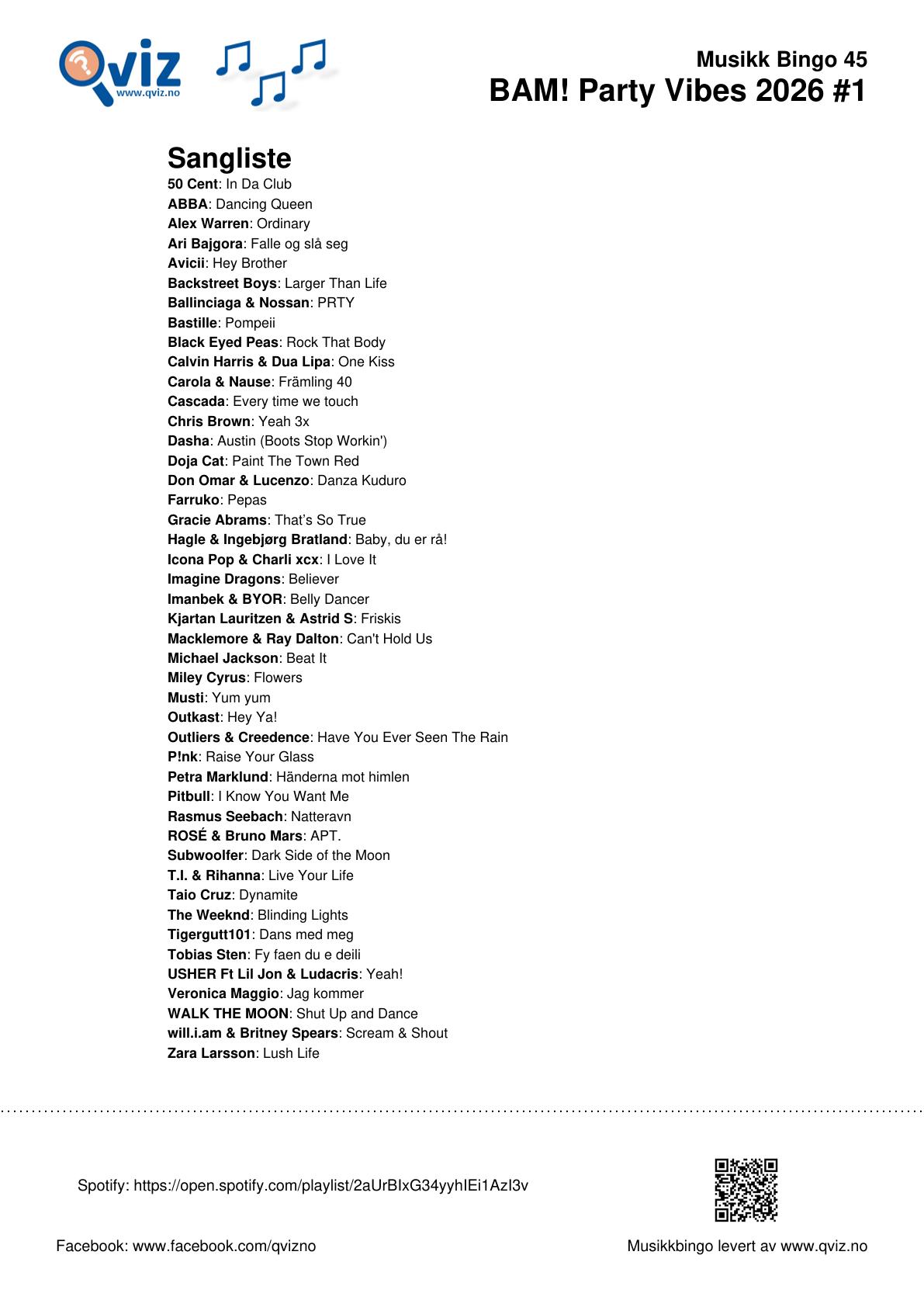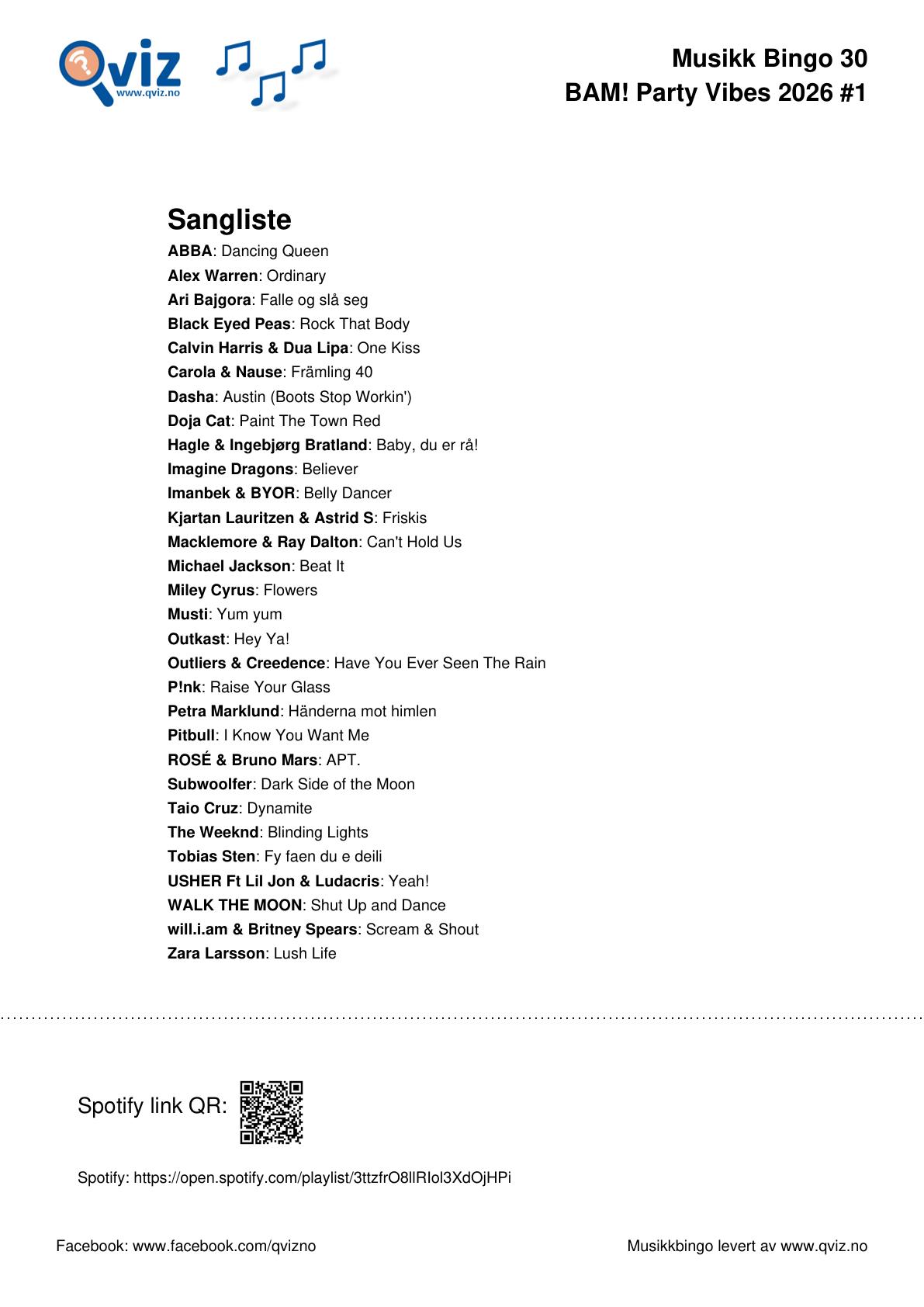 Musikk bingo er basert på denne spillelisten: https://open.spotify.com/playlist/7qFLGpxEOYOdBMObgoLeq3
