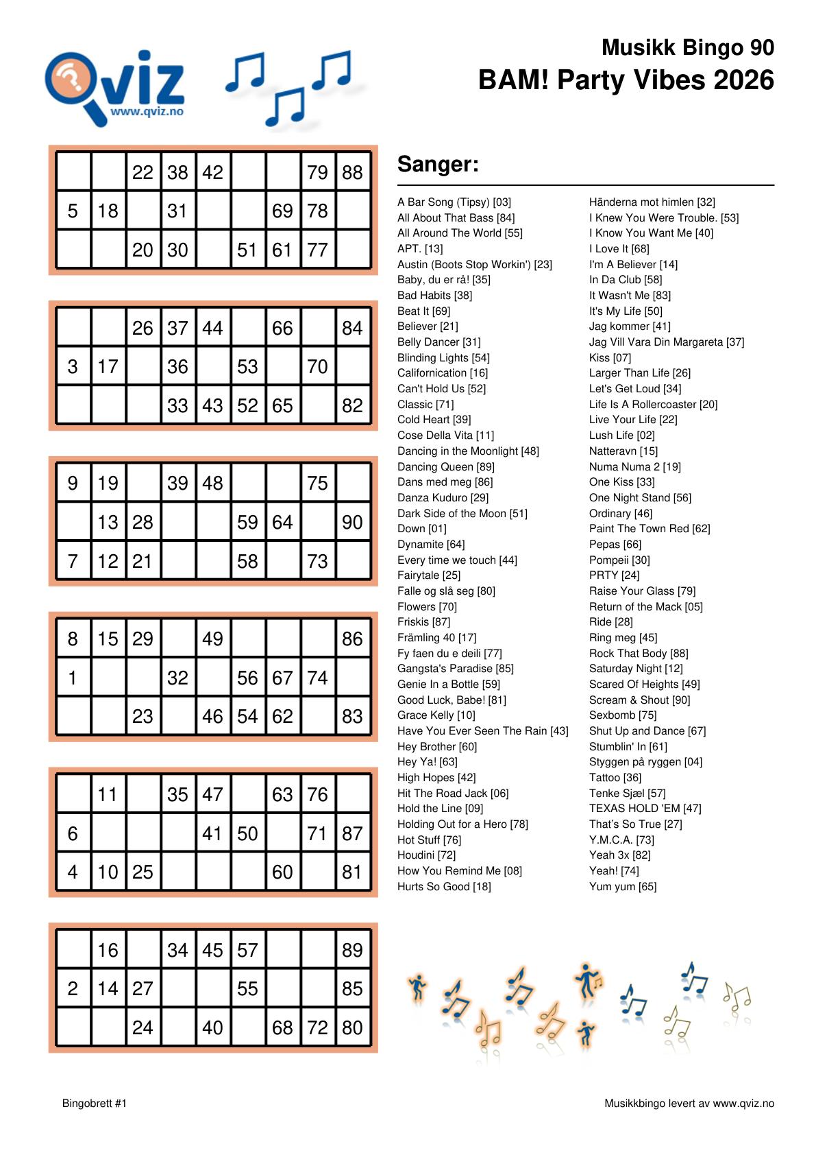 • Til Musikkbingo 90 får du også med en Excel fil som du eventuelt kan bruke til å sjekke om bingo er gyldig.