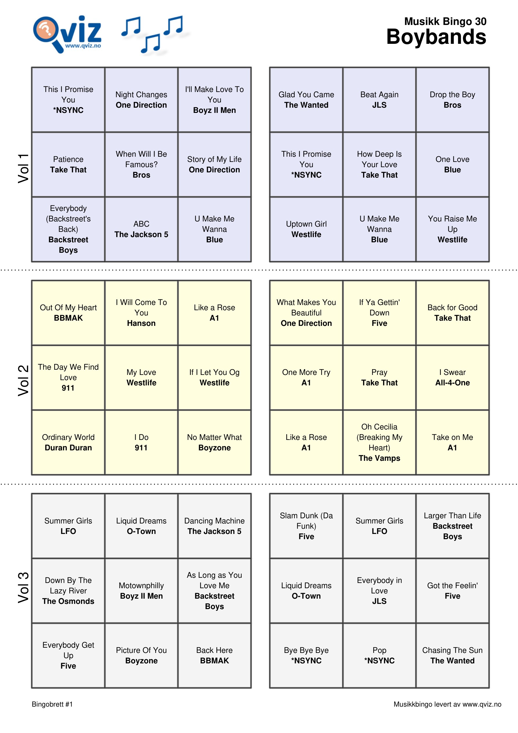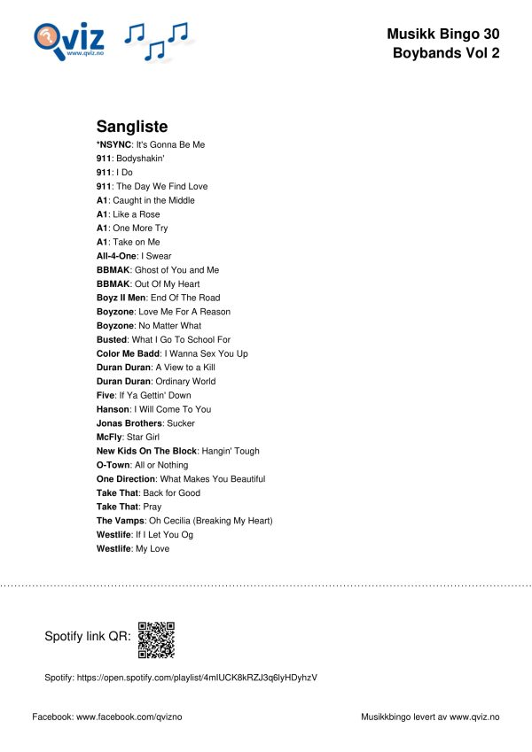 Boybands Musikkbingo er fylt med fengende hits fra noen av tidenes mest populære boyband! Perfekt for alle som elsker gode harmonier, dansbare beats og nostalgiske popklassikere. Her får du alt fra 90-tallshelter og 2000-tallsfavoritter til nyere stjerner – en morsom og energifylt aktivitet som garantert skaper stemning og allsang!