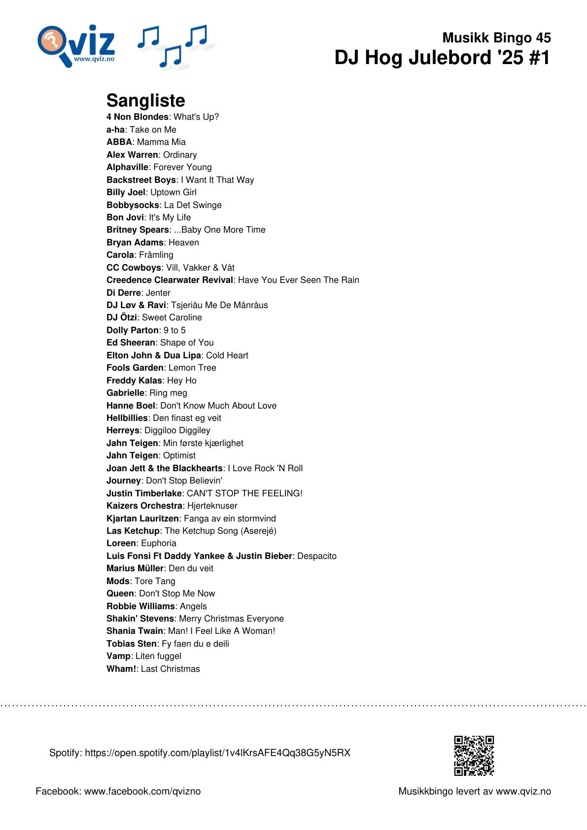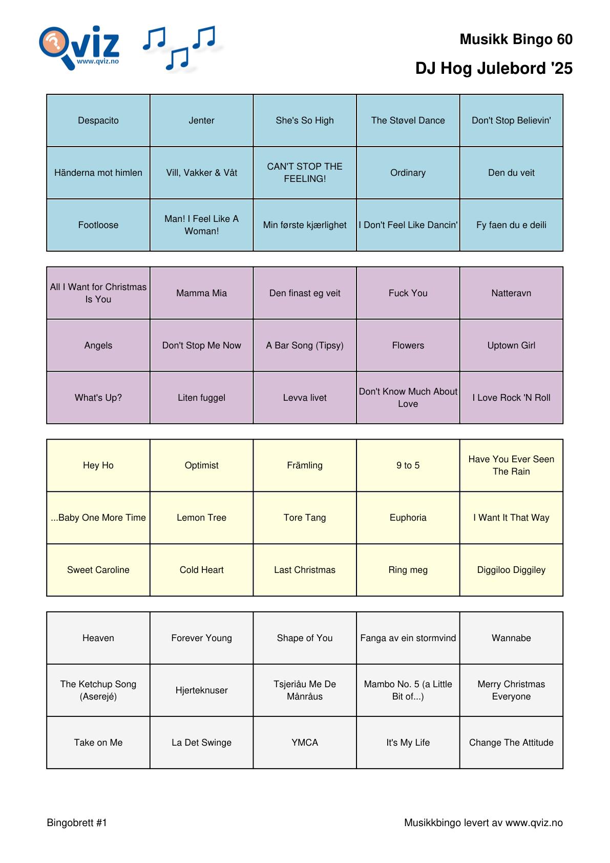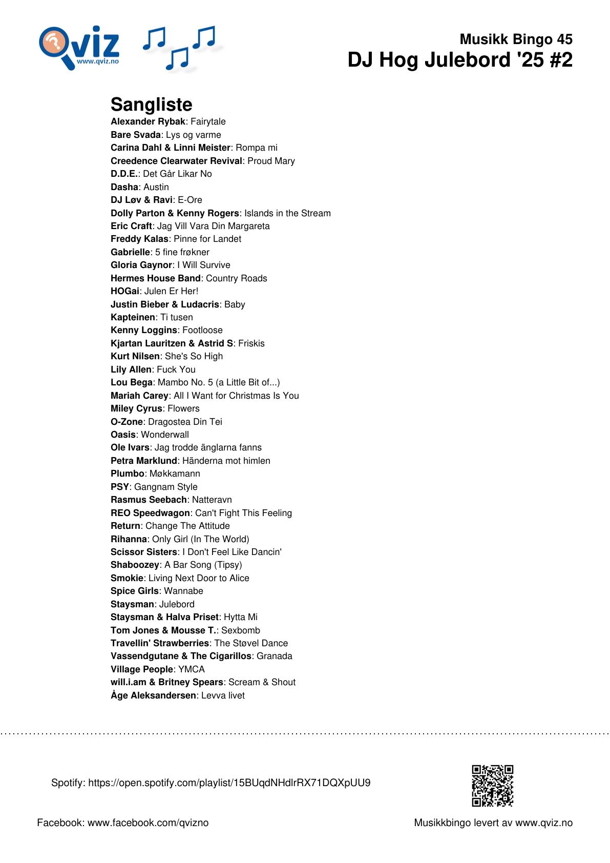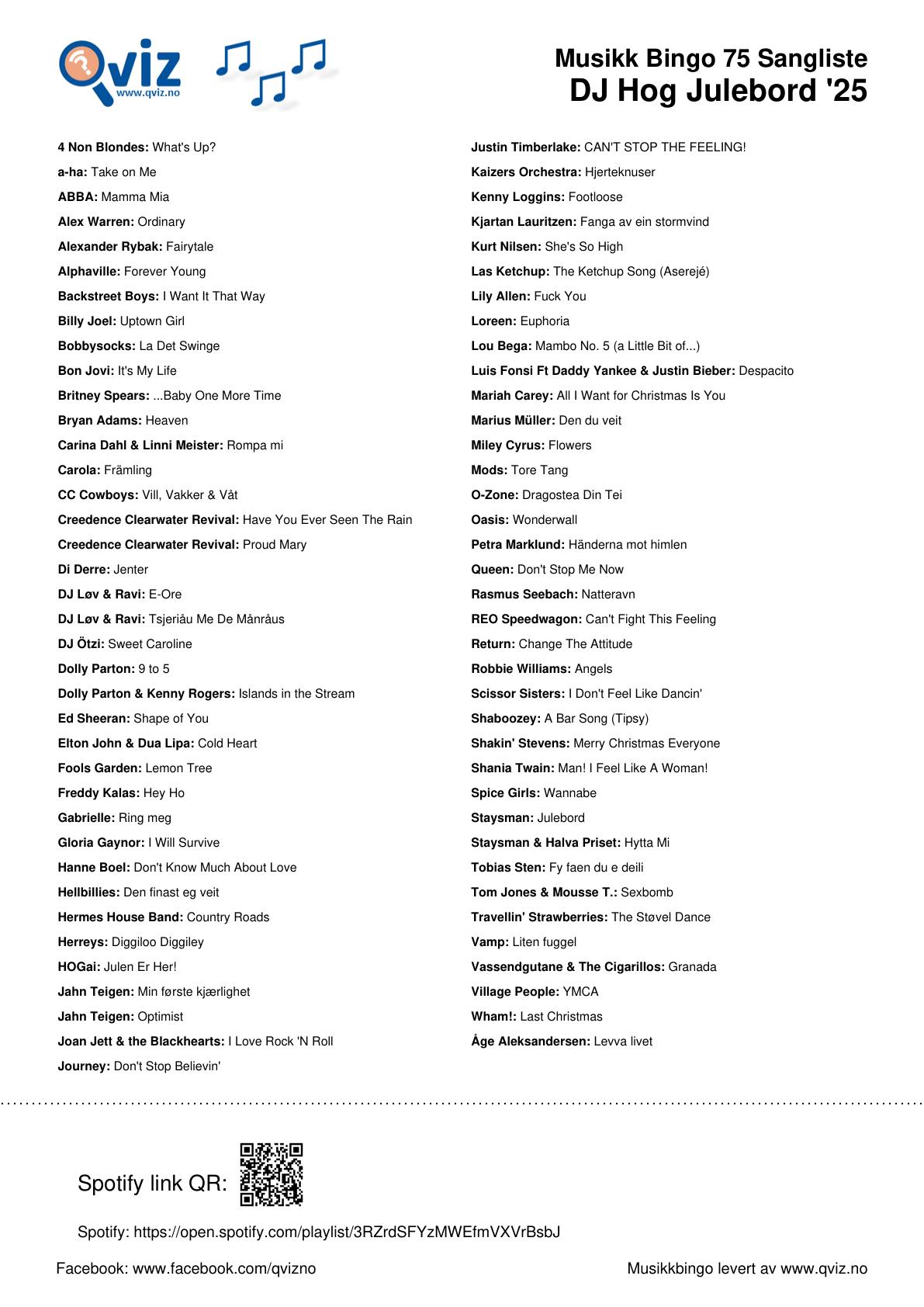 Musikk bingo er basert på denne spillelisten: https://open.spotify.com/playlist/5KkugkY6a47WRzhiwngDhr