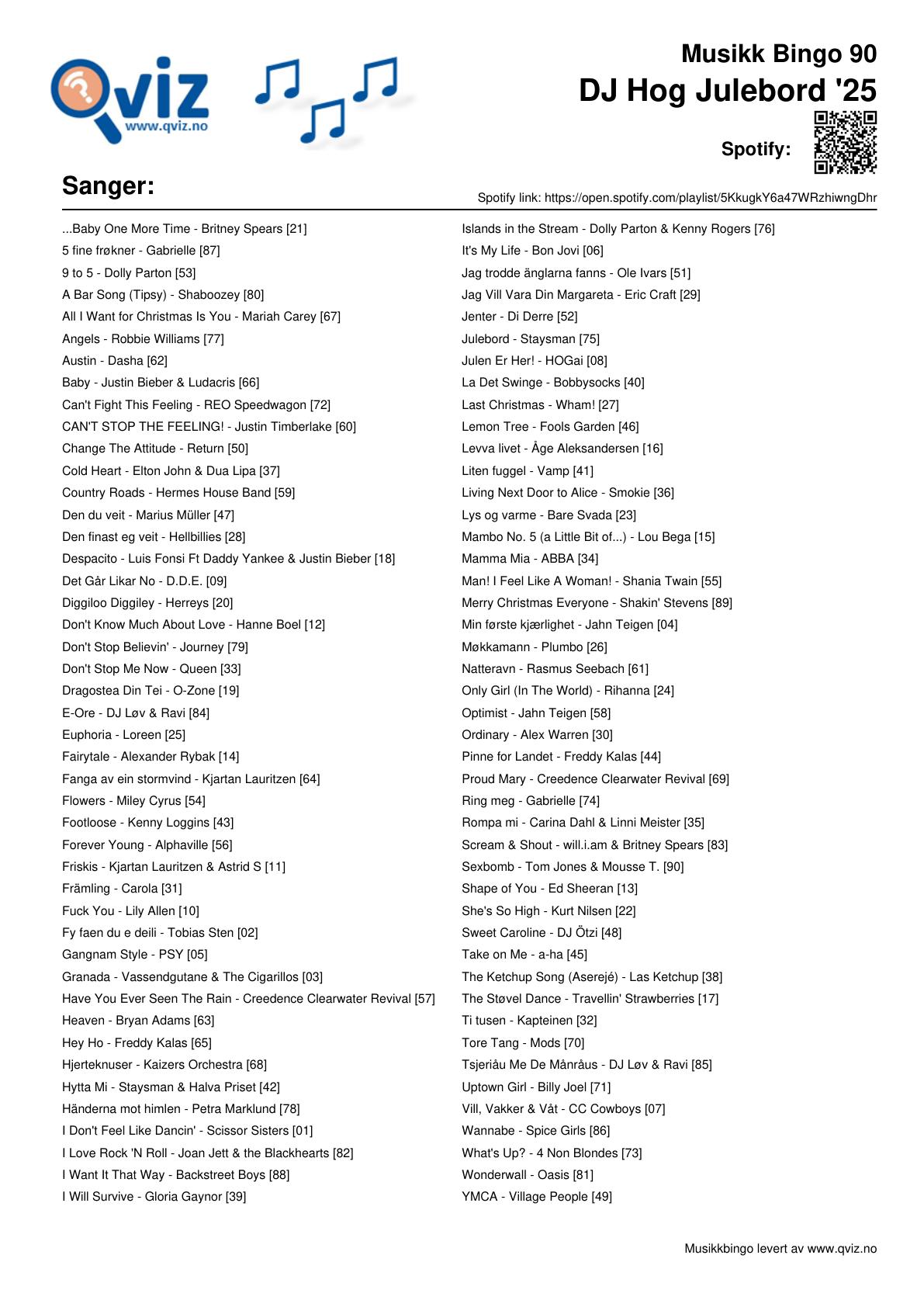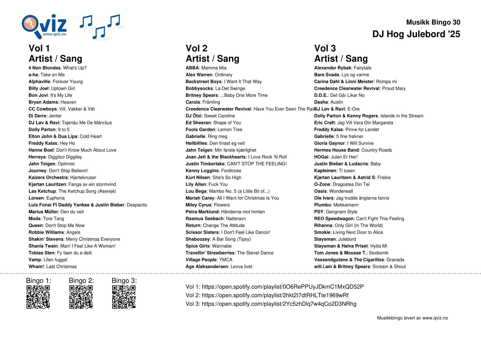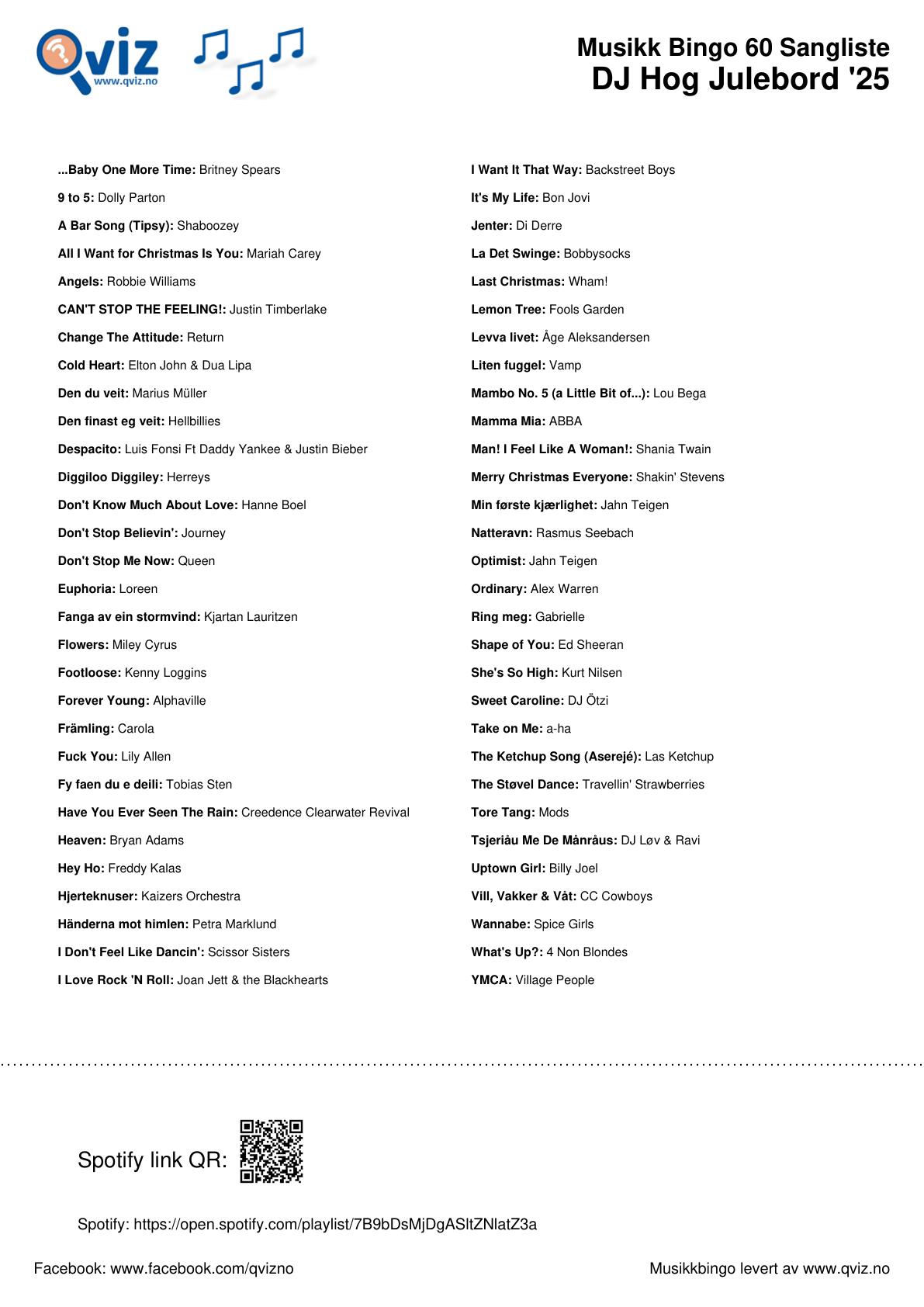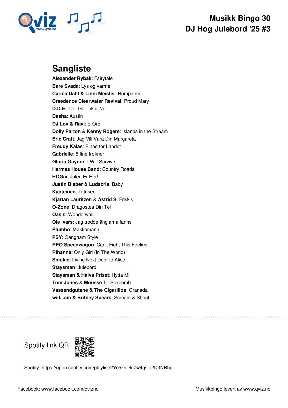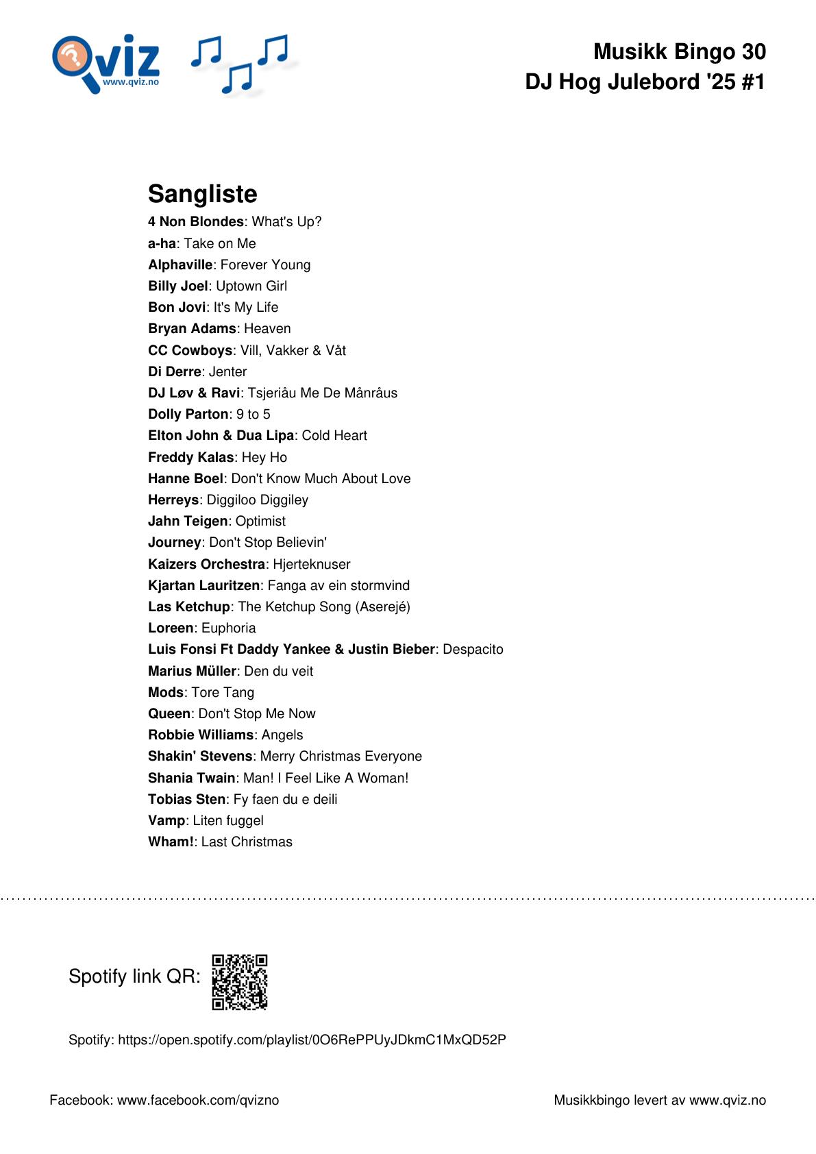 Musikk bingo er basert på denne spillelisten: https://open.spotify.com/playlist/5KkugkY6a47WRzhiwngDhr