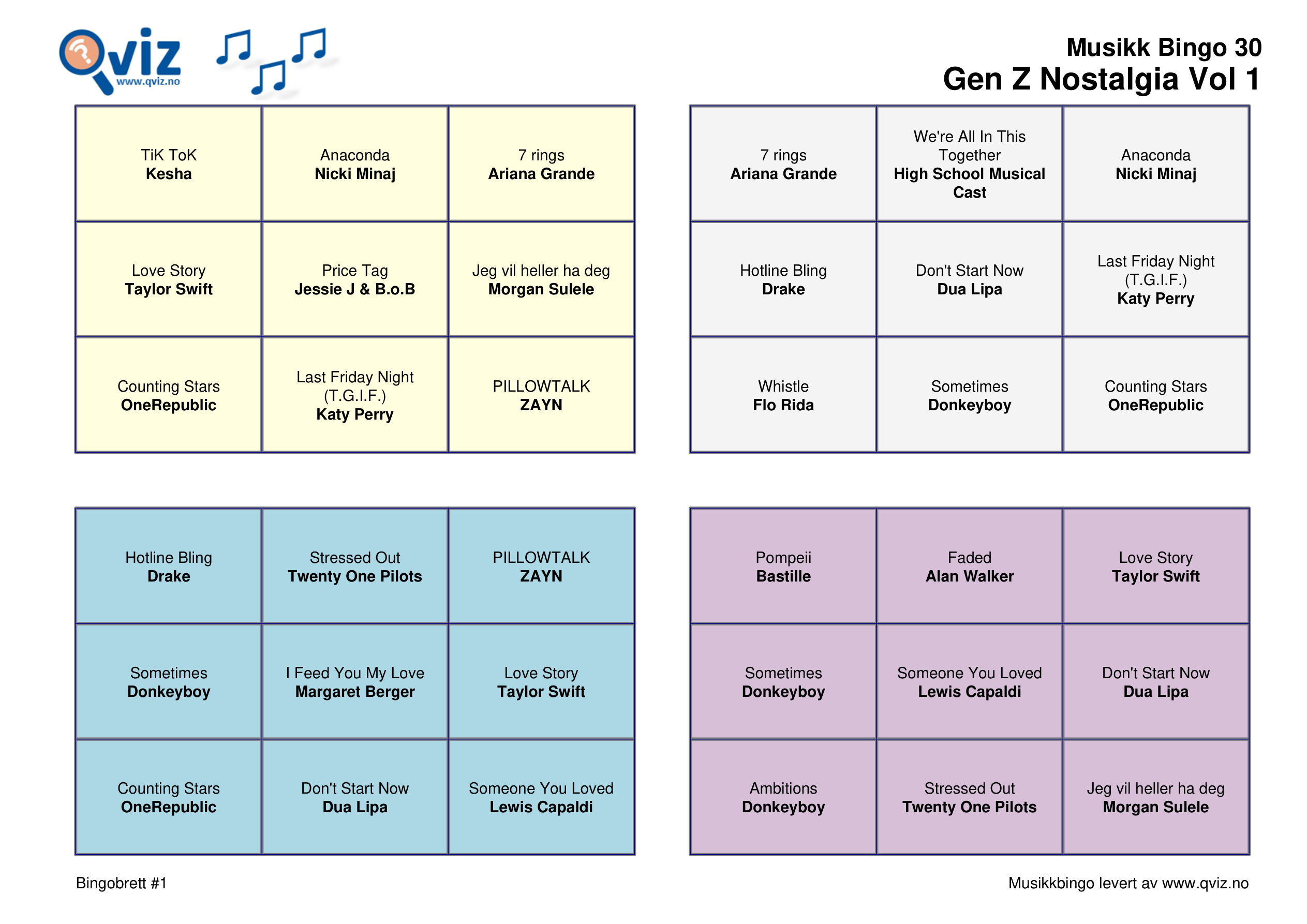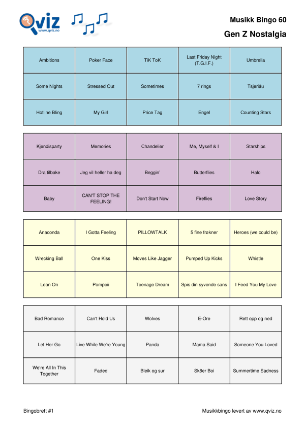 Gen Z Nostalgia er en musikkbingo full av ikoniske sanger og throwbacks fra Generasjon Zs oppvekst. Her får du en festlig miks av hits og minner, fordelt på bingoer i 5 forskjellige format – totalt 90 låter som garantert vekker stemningen!