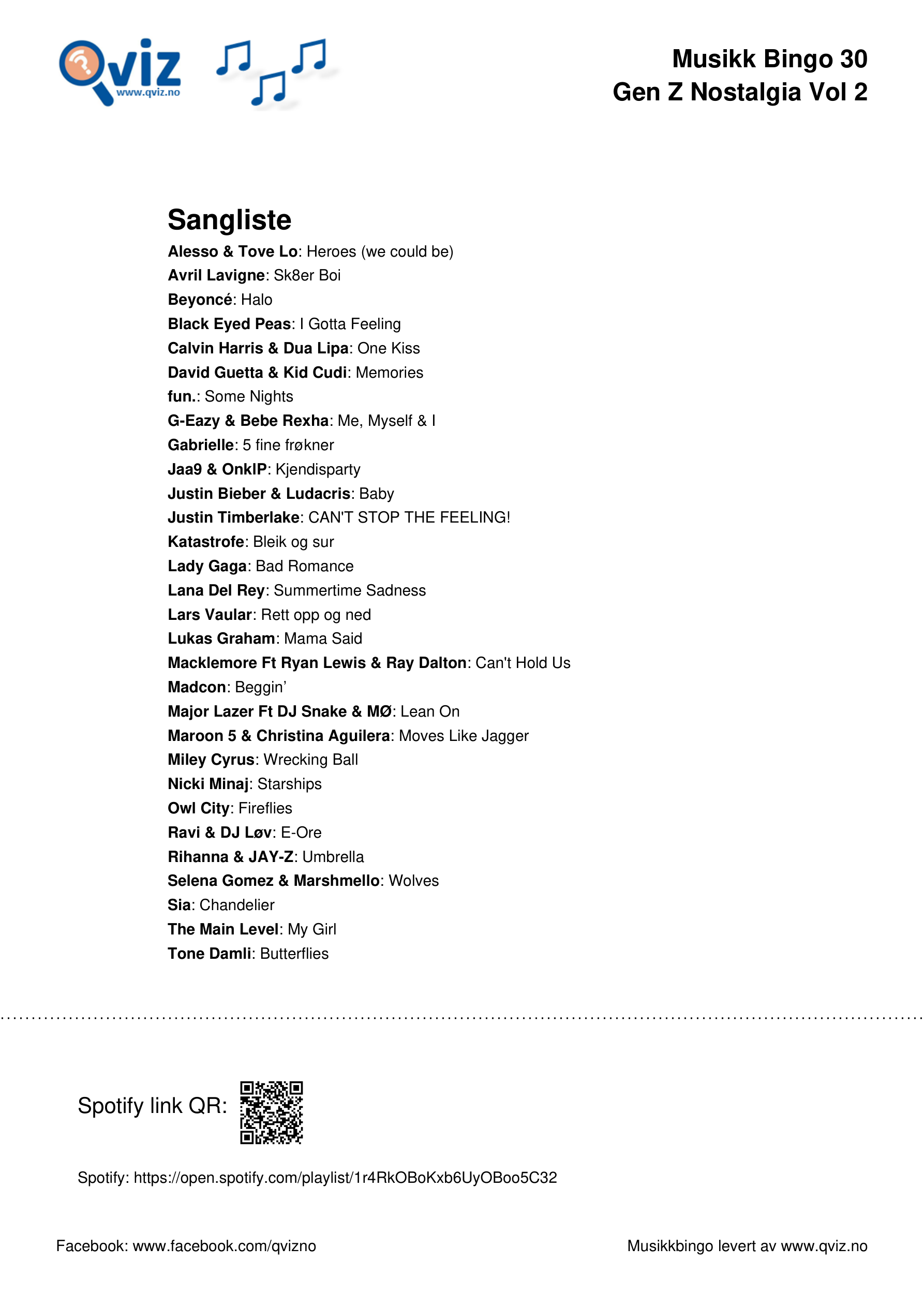 For alle bingoene får du PDF fil med 100 bingobrett og lenke til Spotify spilleliste.